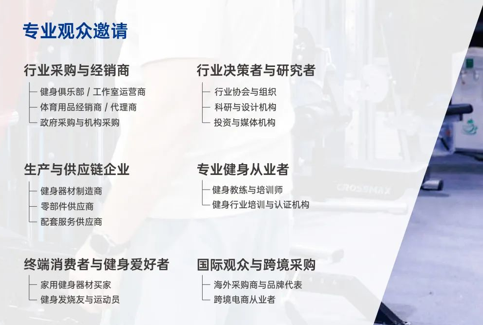 实际上,2026中国体博会观众的整体覆盖面也较往届更加广泛且精准。其中,2026亚太健身及健康生活展区覆盖的专业观众范围包括: