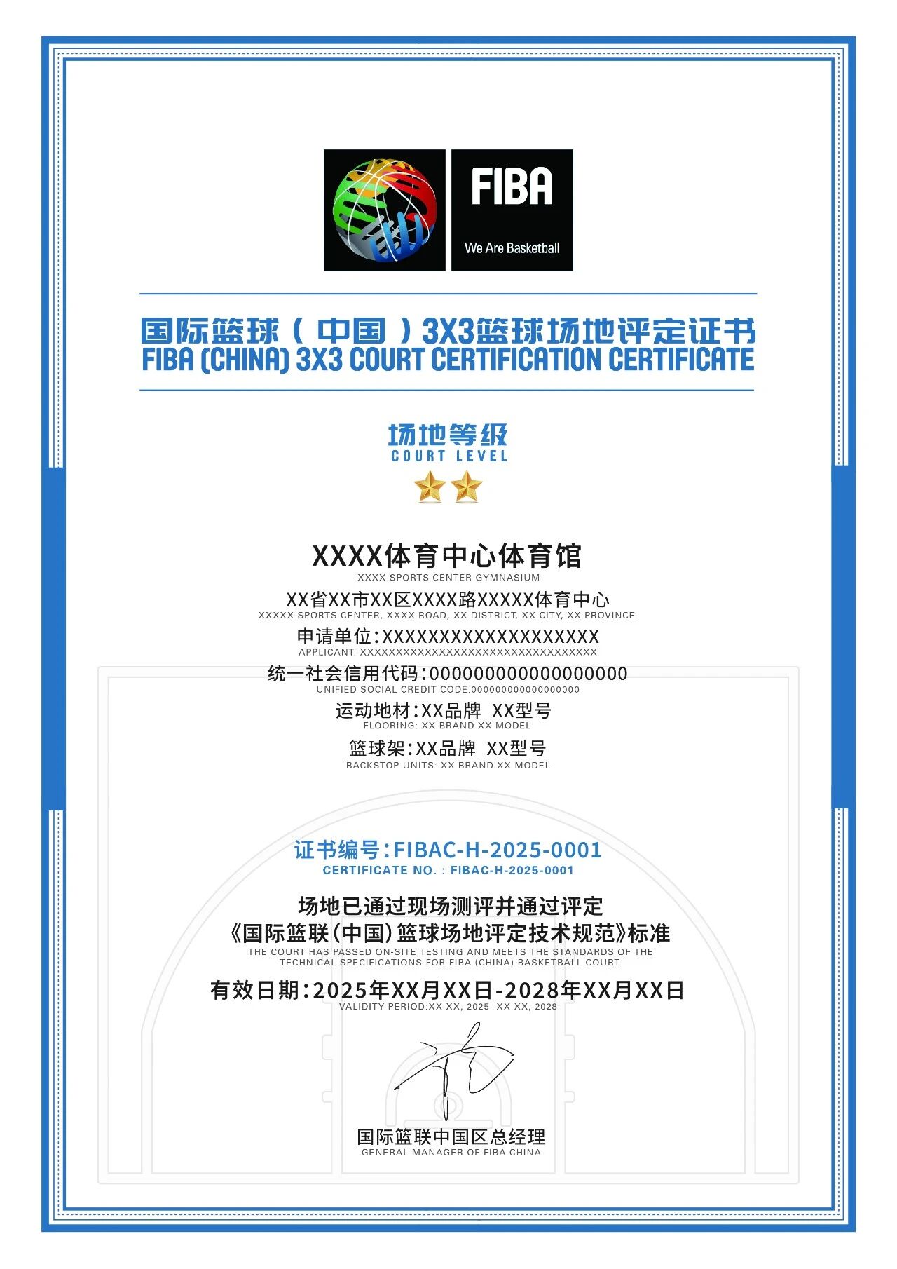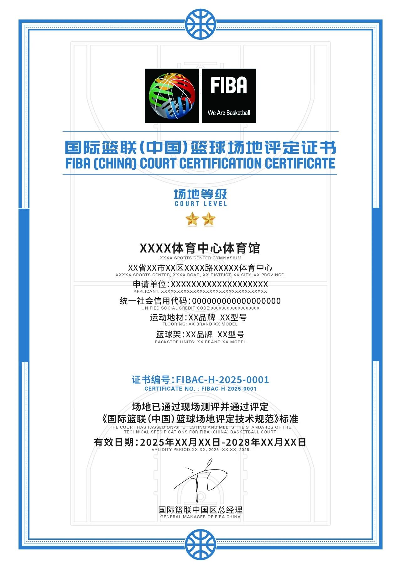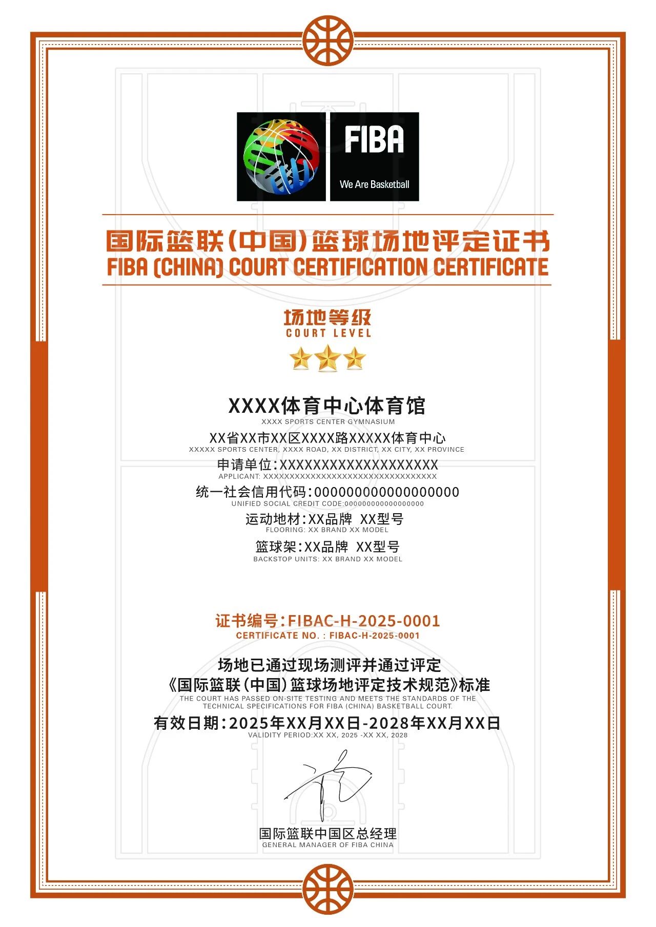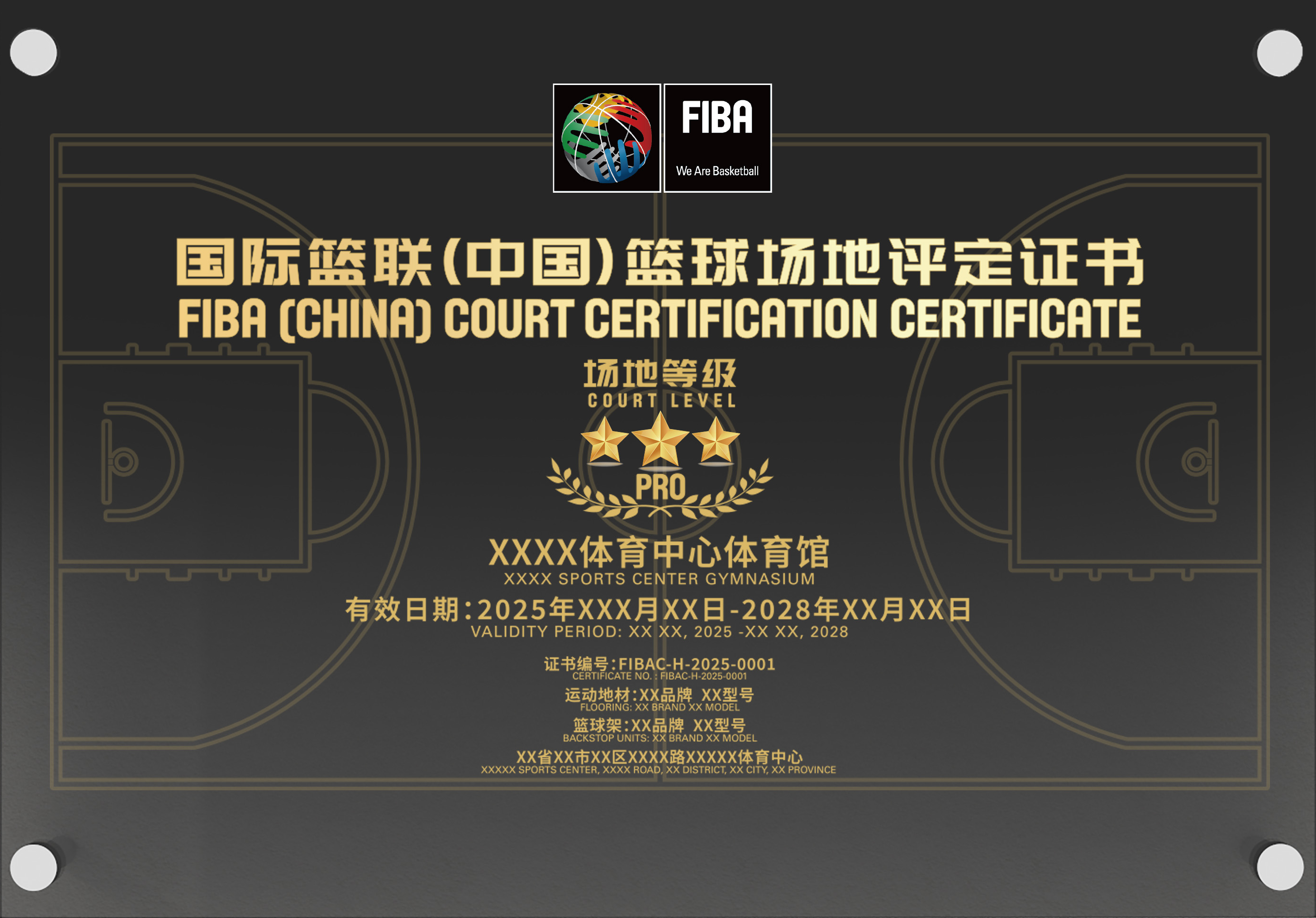 7、审核发证:检测数据经严格审核评估,符合标准的场地将获得国际篮联中国区官方颁发的场地评定证书和场地牌匾。