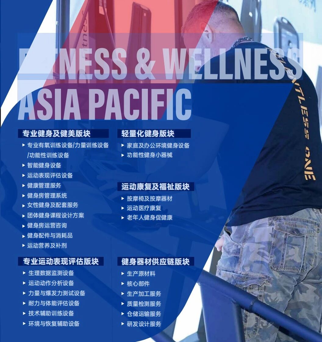 2026中国体博会亚太健身展展区主题前半句是“全品类集结”,意为:2026中国体博会亚太健身及健康生活展区将汇集全球最全面的健身设备、最新的健康科技产品及服务,其展览内容拆分为专业健身及健美、专业运动表现评估、轻量化健身、运动康复及福祉、健身器材供应链等五大板块,包括专业有氧训练设备/力量训练设备/功能性训练设备、智能健身设备、运动表现评估设备、健康管理服务、健身房管理系统、女性健身及配套服务、团体健身课程设计方案、健身房运营咨询、健身配件与消耗品、运动营养及补剂、生理数据监测设备、运动动作分析设备、力量与爆发力测试设备、耐力与体能评估设备、技术辅助训练设备、环境与恢复辅助设备、家庭及办公环境健身设备、功能性健身小器械、按摩椅及按摩器材、运动医疗康复、老年人健身促健康、生产原材料、核心部件、生产加工服务、质量检测服务、仓储运输服务、研发设计服务等多元化品类——组委会希望籍此整合全球领先的健康科技与创新服务,推动健身行业向智能化、个性化和可持续化方向发展,为亚太地区消费者带来更高效、更便捷的健康生活解决方案,同时促进产业链上下游的协同创新与价值提升。