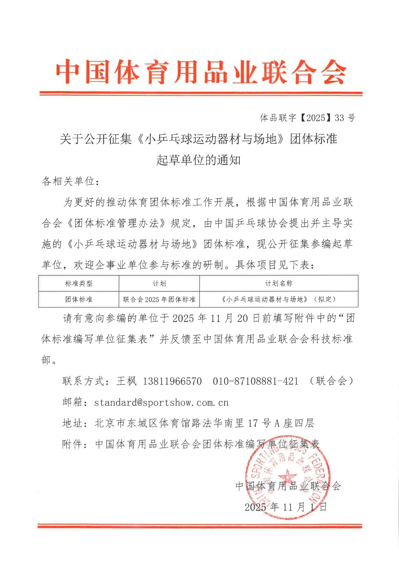 请有意向参编的单位于2025年11月20日前填写附件中的“团体标准编写单位征集表”并反馈至中国体育用品业联合会科技标准部。