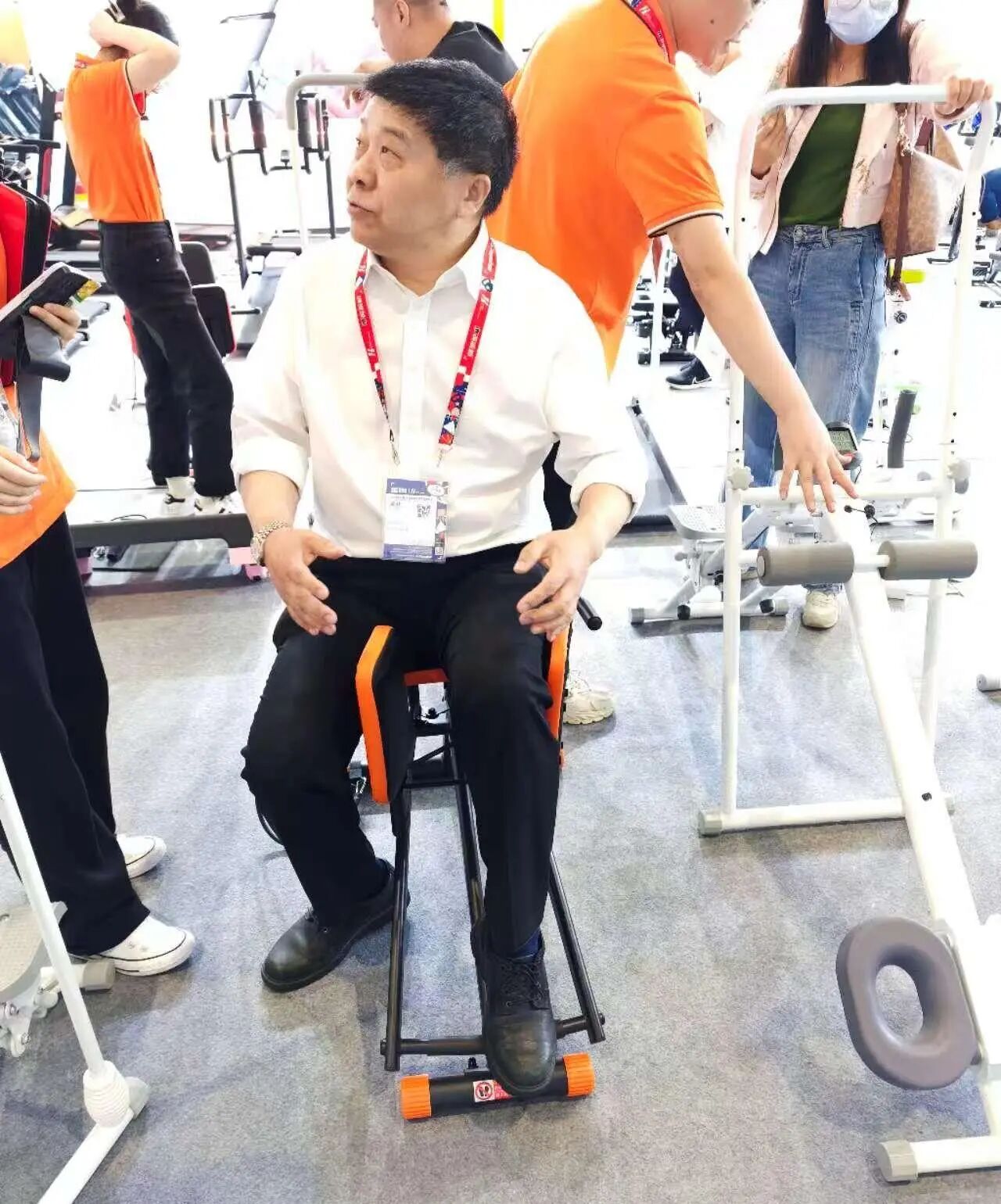 图丨沈国强在2025中国体博会期间在一参展企业展位体验新产品