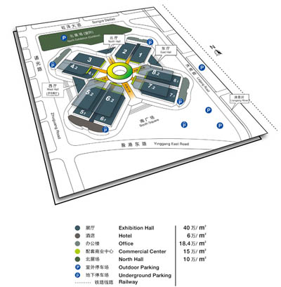 综合体可展览面积50万平方米,包括40万平方米室内展厅和10万平方米室外展场。室内展厅由13个单位面积为2.88万平方米的大展厅和3个单位面积为1万平方米的小展厅组成,全方位满足大中小型展会对展览面积的需求。