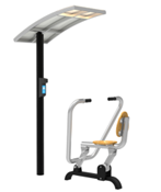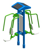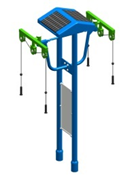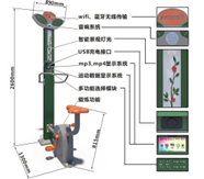本器材配套太阳能板遮阳棚、照明及太阳能蓄发电系统、USB手机充电功能,配备触摸屏可显示及语音播报运动信息, 通过微信服务号平台可以记录锻炼信息,观看器材使用视频及现场报修,收集健身人群及健身设备的数据信息。