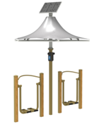 青年健身站采用太阳能板发电供电,安装智能感应电灯4盏,电灯由延时继电器控制,可根据实际情况调节灯点亮和熄灭的时间。设计安装了音响播放系统,具有自带蓝牙控制功能,可使手机与其互联,使用者可以播放自己手机中喜爱的音乐歌曲。伞架上配备防水USB快充接口,方便使用者对播放设备进行及时充电;