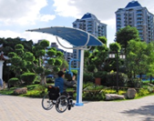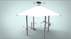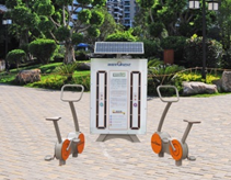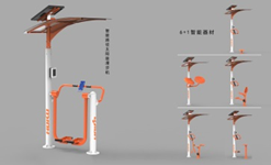 采用风光互补发电提供电源,配备人机互动屏幕,开发有微信小程序实现数据收集与分析,可实现心率监测、运动次数与时长、卡路里消耗情况等功能,并提供移动设备充电端口和实时天气预报播放服务。