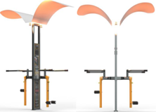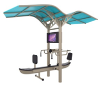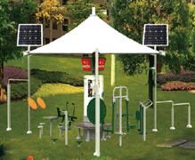 本器材配套膜结构遮阳棚、照明及太阳能蓄发电系统、USB手机充电功能,配备触摸屏可显示及语音播报运动信息, 通过微信服务号平台可以记录锻炼信息,观看器材使用视频及现场报修,收集健身人群及健身设备的数据信息。