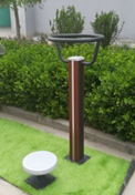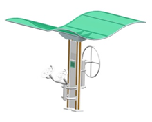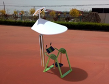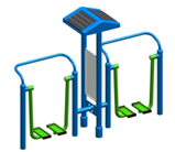本产品根据社区、公园等实际情况,采用景观设计理念,实现智能、健身、环保、节能目的而设计。主立柱上端设有椭圆伞,顶部安装太阳能板,中上部设有液晶显示屏,下面两侧安装骑马机健身器材,实现健身锻炼功能。