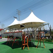 健身站为钢架双锥拉膜结构,通过内部产生一定的预张应力以形成空间,并能承受外荷载作用的一种空间膜结构形式,双锥伞膜造型即实现了室外遮阳避雨功能又成为公园中飘逸的一景。