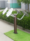 户外景观自行车,该产品独特的造型构造,双位运动位设计,由智能化运动系统、调节阻尼系统、灯光系、太阳能全天供电系统组成、室外健身车结合塑木组成。连接部位使用法兰进行连接。采用预埋件结构安装