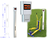 本产品主立柱管材尺寸采用200×150×3.0mm的优质钢板一次成型,转动部位内置限位装置,骑马机摆动件与立柱内侧距离及在使用中各结构件的内侧距离240mm,防止产生挤压、卡夹、碰撞的伤害可能;标准件采用优质不锈钢螺丝、螺母、平垫,并加不锈钢防护帽,具有防盗、防锈、防松功能,减少器材的破坏力,需专用工具方可拆卸;器材转动部位采用国家标准轴承,并采用防水、防尘措施;钢材表面经过两次表面抛沙除锈和净化处理,后静电喷涂,涂层厚度70-90μm;采用预埋式固定在地面上,稳定可靠;信息部分采用霍尔元件与磁铁进行数据采集,液晶显示屏可显示时间、速度、距离、心率、卡拉里等参数,通过手机软件可进行运动数据传输,实现智能分享;液晶显示屏采用太阳能提供电源,节能环保。