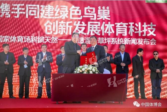 在活动中,国家体育场(鸟巢)与广州傲胜人造草股份有限公司签署了科缤天然-人造混合草坪系统共建合作协议,这是AVG傲胜股份继为2008年北京奥运会提供专业人造草坪足球场和棒球场、2015年成为鸟巢独家供应商之后与国家体育场(鸟巢)的再次合作,双方将共同推动中国体育以及更多高标准足球场地的建造和升级,为中国足球事业发展贡献力量!