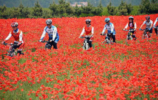 图为2015年5月16日,自行车运动爱好者在万亩花海的美景下骑行。新华社记者范长国摄
