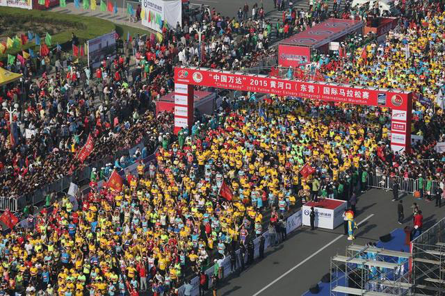 图为2015年黄河口国际马拉松赛鸣枪。新华社发