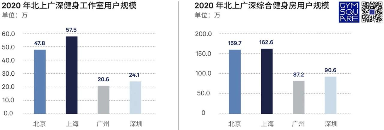 按照精练GymSquare《2020中国健身行业报告》统计的健身用户规模,北上广深依然是中国健身用户最为密集的区域,人口渗透率平均值接近10%,但如果放大到全国仍然不及2%。