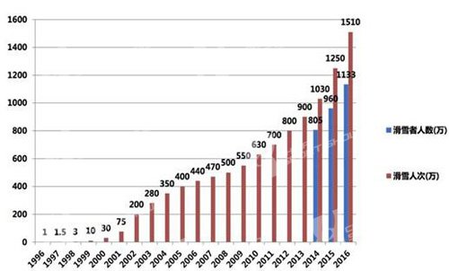 2016年全年滑雪人次1510万,滑雪人口1133万,平均每人参与滑雪1.33次,较2015年每人滑雪1.30次、2014年每人滑雪1.27次有明显上升。这一数据表明,在滑雪总人口、总人次上升的情况下,滑雪发烧友的比例也在稳步增长。