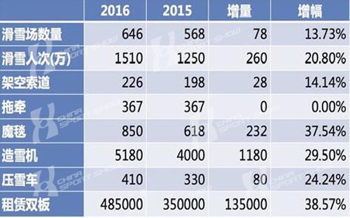在今年2月举办的亚太雪地产业论坛上,万科集团冰雪事业部首席战略官伍斌发布了《2016年中国滑雪产业白皮书》。据报告统计,2016年中国滑雪人次达1510万、总滑雪人口为1133万人。滑雪场建设速度不减,全年新增雪场78家,总数达646家,架空索道、魔毯、造雪机、压雪车、租赁双板依然保持较高增速,其中适合初学者使用的魔毯增速最高,另一种常用于初级道的提升设备拖牵增长停滞。