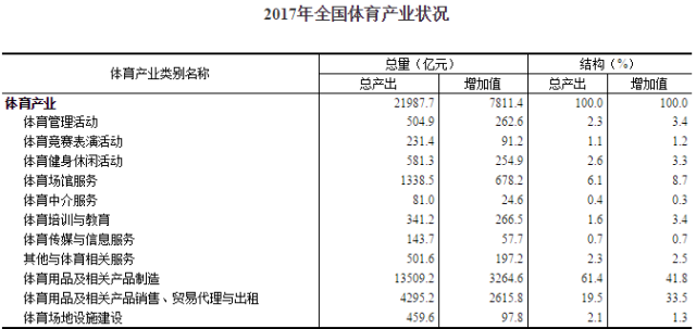 十年之后, 这一结构发生了些许变化。公开数据显示,2017年,全国体育产业总规模(总产出)为21987.7亿元,增加值为7811亿元,2017年,体育用品及相关产品制造的总产出和增加值分别为13509.2亿元和3264.6亿元,增长速度分别为12.9%和14.0%,依旧是体育产业中贡献最大的,占到总产出的61.4%,增加值的41.8%。